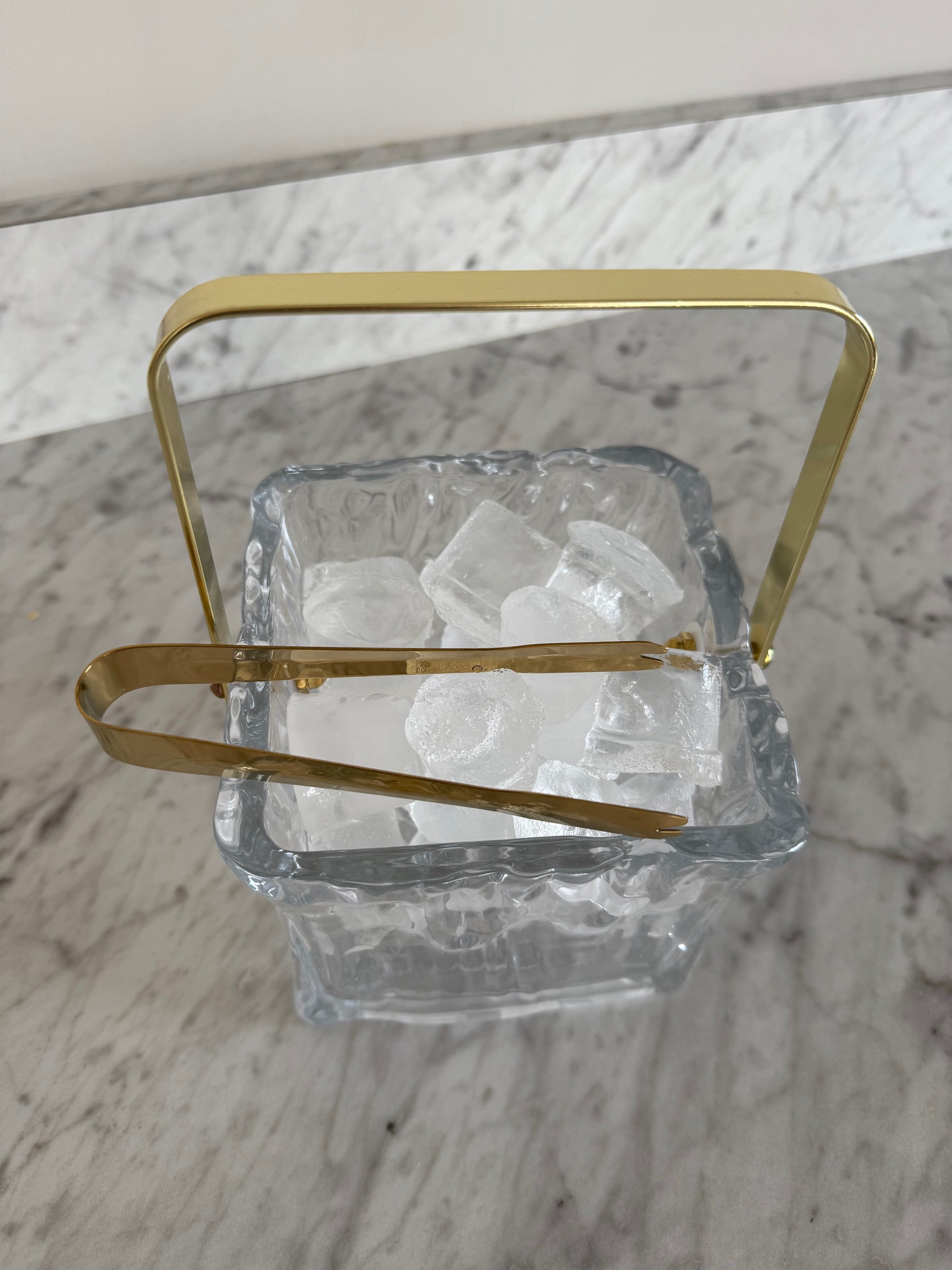 Textured glass ice bucket with gold handle and tongs. The cutest accent to your bar.